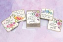 Front: Varies by card Inside: Varies by card Product Details: One box of 16 assorted sympathy cards, 4 each of 4 designs, and 16 full-size white envelopes, which do not require extra postage. Cards are 5" x 5" square, feature artwork inside and out, and come in a sturdy box with Velcro closure.